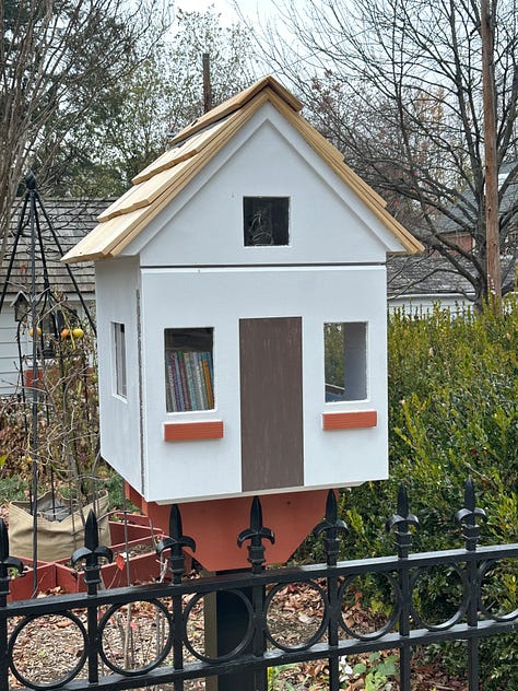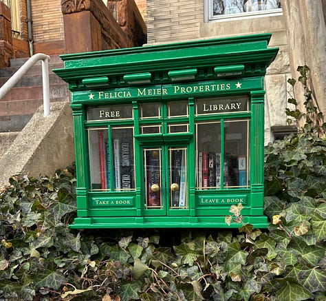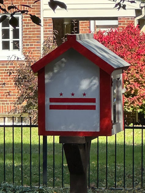 My neighborhood is thick with these wonderful expressions of community which I began to document during the pandemic when an afternoon walk (sometimes on the phone with a work colleague, sometimes alone with my thoughts) was key to my sanity. At this writing, my own Google map has over 170 boxes in DC and the close-in Montgomery County suburbs I frequent — more than are noted on the official Little Free Library map but far fewer than the 400 plus boxes identified by a guy named Akiva Fishman whom I read about on Axios. (Hey Akiva, if you are listening, you missed a bunch in my neck of the woods.) For the record, I am not the owner of one of these boxes. But my next door neighbor is and one per block seems sufficient.